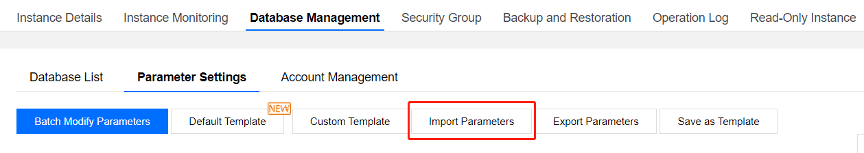 2. データベース管理 >パラメータ設定ページを選択し、パラメータのインポートをクリックします。