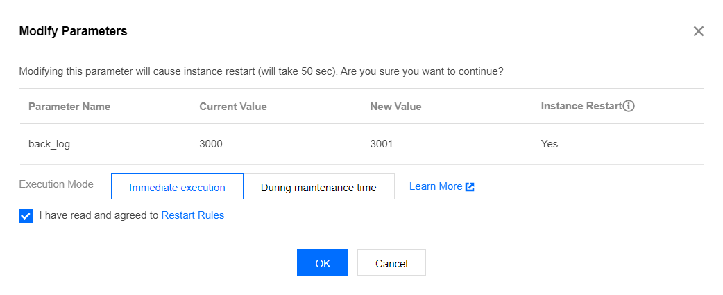 変更されたパラメータを有効にするためにインスタンスを再起動する必要がある場合は、再起動するかを確認するメッセージが表示されます。サービスのオフピーク時間帯に操作すること、及びアプリケーションに再接続メカニズムがあることを確認することをお勧めします。