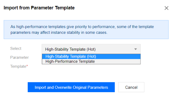 2. データベース管理 > パラメータ設定を選択し、デフォルトテンプレートをクリックすると、高安定性テンプレートまたは高性能テンプレートを選択できます。その後、インポートして元のパラメータを上書きするをクリックします。