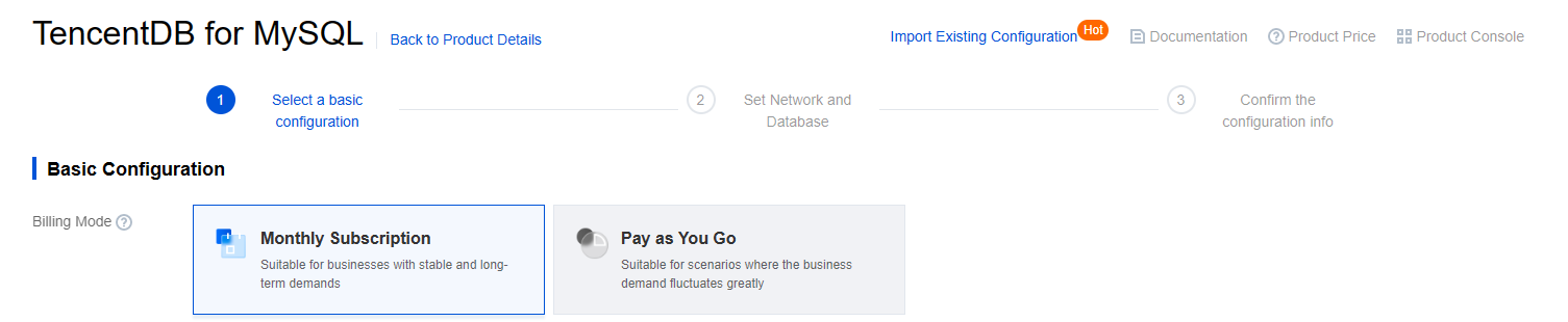 1. MySQL購入ページにログインし、必要に応じて基本設定とインスタンス設定を完了し、次のステップ:ネットワークとデータベースの設定をクリックします。 基本構成