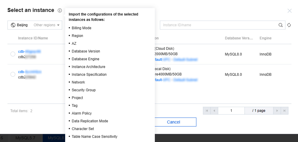 新しい購入ページではワンクリックで既存の設定をインポートできます。ログインしたアカウントに作成されたTencentDB for MySQLインスタンスが存在する場合、この機能を使用してインスタンス購入ページの各パラメータを自動的に設定し、既存の設定を使用して簡単な調整、速やかな購入ができます。操作ガイドラインは次のとおりです。