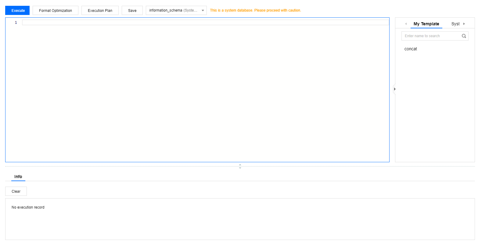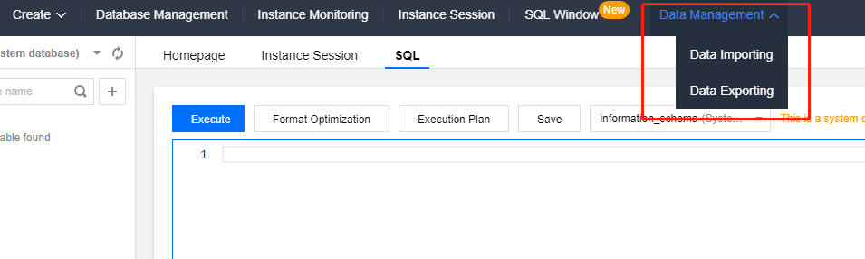 DMCコンソールにログインし、最上部のナビゲーションの【SQLウィンドウ】、または左側のバーの表「操作」メニューの【SQL操作】をクリックして、SQLウィンドウページに移動します。SQLウィンドウは次の機能をサポートします。 SQLコマンドの実行および結果の表示