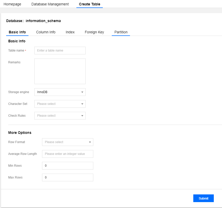 1. DMCコンソールにログインし、ナビゲーションバーで【新規作成】>【ライブラリの新規作成】>【データベースの新規作成】または【新規作成】>【テーブルの新規作成】を選択します。 2. ポップアップで表示されたダイアログボックスで、新規作成するデータベーステーブルの設定を行います。