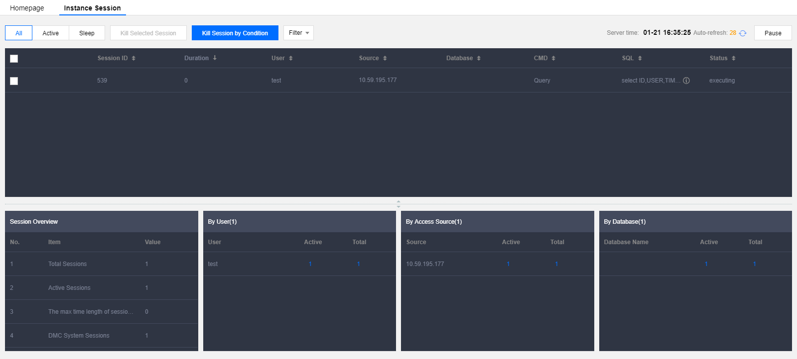 DMCコンソールにログインし、ナビゲーションバーで【インスタンスセッション】をクリックし、インスタンスセッションページに移動すると、ユーザーは現在のデータベースのすべてのインスタンスセッションの詳細情報を確認することができ、またセッションの概要、ユーザー、アクセスソースおよびデータベースという4つの異なる次元から情報を表示することができます。 DMCは、ユーザーがセッションを管理しやすいよう、セッションをkill(強制終了)する機能を提供します。