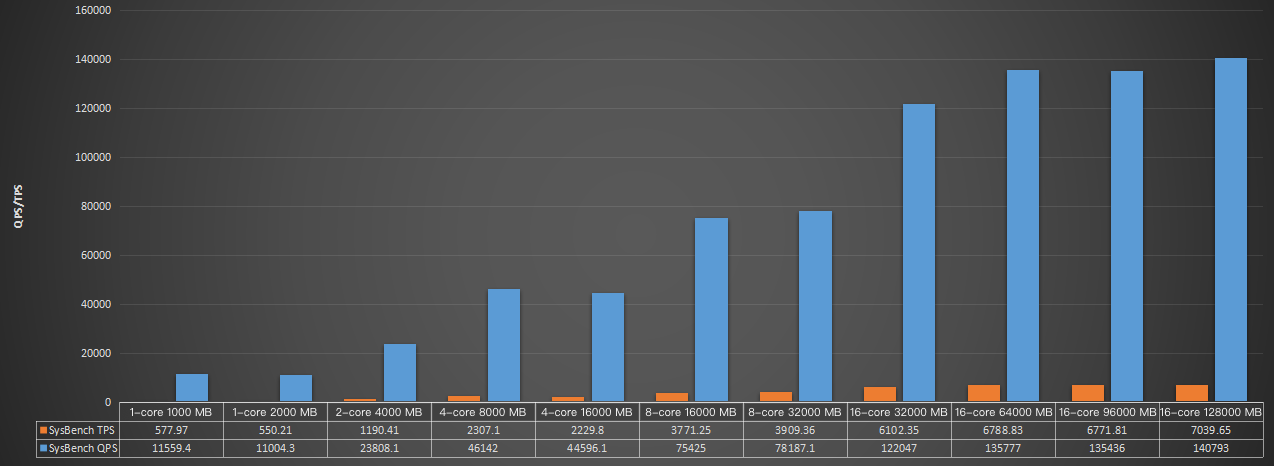 CPU (core) | メモリ (MB) | 並列処理度 | 単一のテーブルのデータ量 | テーブル総数 | SysBench TPS | SysBench QPS | avg_lat |