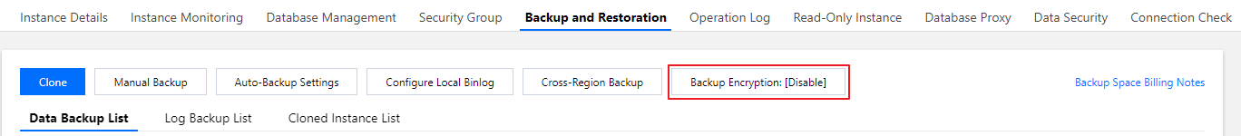 バックアップ暗号化を有効にすると、コンソールでバックアップを使用するときに手動でバックアップを復号化する必要はありません。バックエンドは自動的にバックアップを復号化し、関連する操作 (クローン作成など)を実行します。ただし、暗号化されたバックアップをデバイス内にダウンロードする場合、後続でこのバックアップを復号化できるよう、対応するバックアップ暗号化ファイルのキーをダウンロードする必要があります。バックアップファイルの復号化については、物理データによるデータベースの復元をご参照ください。 バックアップ暗号化の有効化