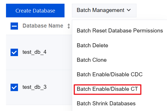 2. On the instance management page, select the Database Management tab, select the rows of the target databases, and click Batch Management > Batch Enable/Disable CT at the top of the list.