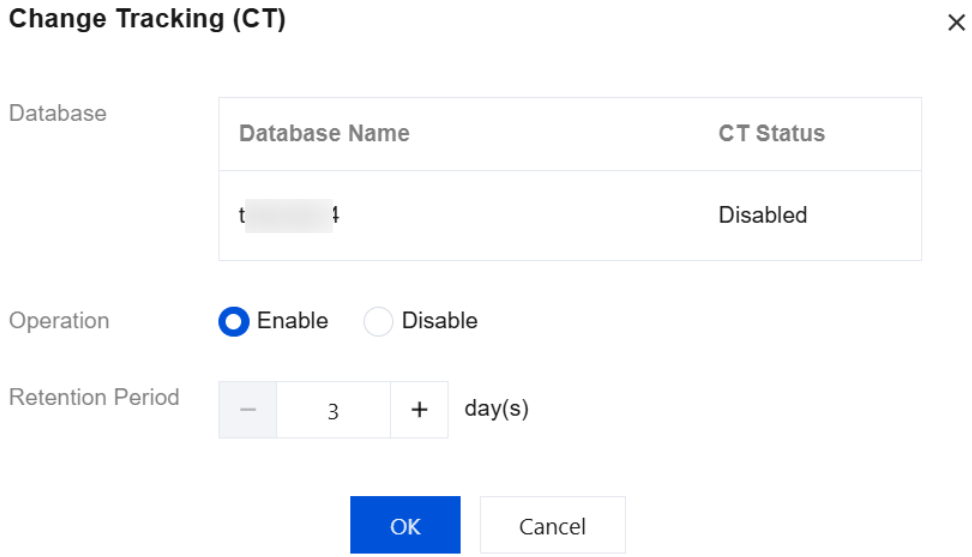 3. The pop-up window displays the names and current CT status of the databases. After enabling or disabling CT, click OK. If you enable CT, you can set the data retention period.