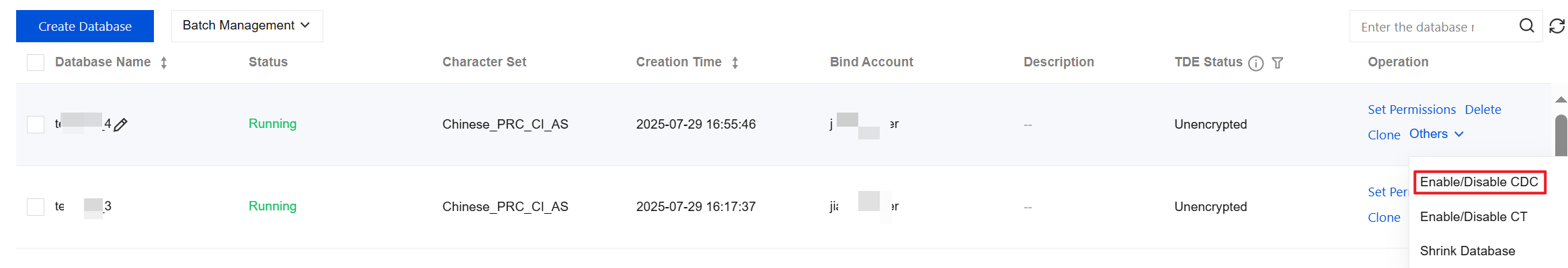 1. Log in to the TencentDB for SQL Server console and click Instance ID or Manage in the Operation column in the instance list to enter the instance management page. 2. On the instance management page, select the Database Management tab, locate the row where the target database is located, and select Others > Enable/Disable CDC in the Operation column.