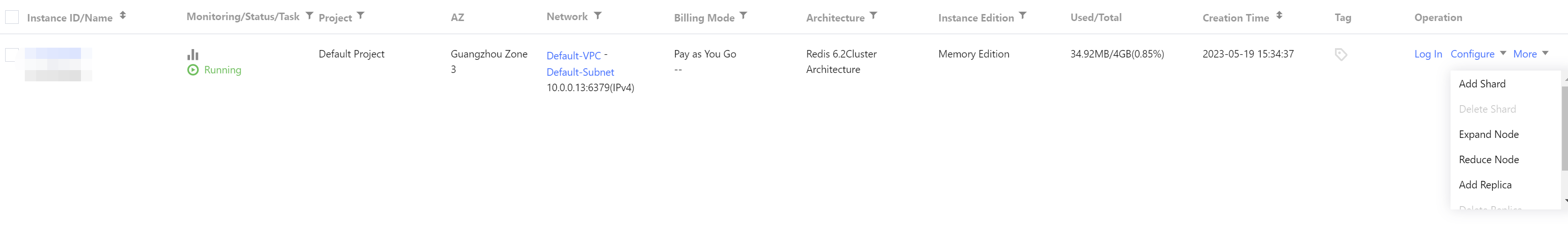 3. After the upgrade is completed, go to the instance list and select Configure > Add Shard in the Operation column.