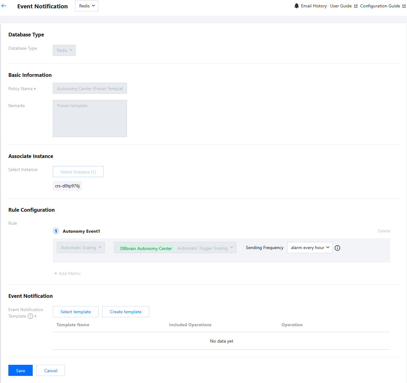 5.1 Modify the sending frequency of automatic scale-out autonomy events and the event notification template on the event notification page, and then click Save.