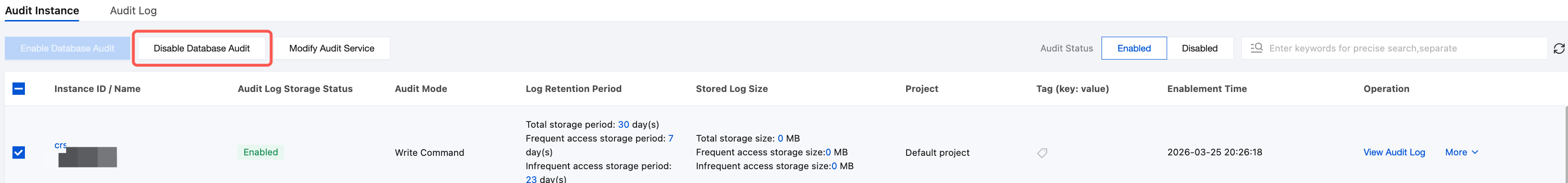 Batch Disable: In the audit list, select multiple instances that require the audit feature to be disabled, click Disable Audit Service above the list.