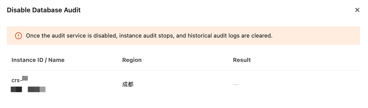 Warning: After the audit service is disabled, auditing of instances will be stopped and historical audit logs will be cleared.