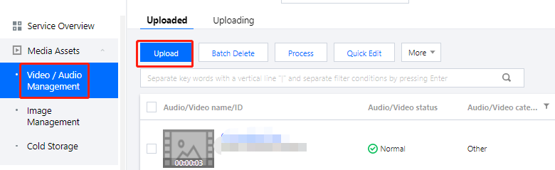 1. VODコンソールにログインし、メディア資産管理>オーディオビデオ管理を選択して、デフォルトで「アップロード済み」画面に進みます。