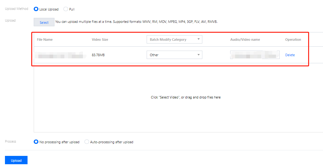 5. ローカルからのアップロードを選択してローカルファイルをコンソールに直接アップロードします。オーディオビデオの選択をクリックし、ローカルオーディオビデオを選択するか、またはオーディオビデオファイルをアップロード待ちリストエリアにドラッグします。