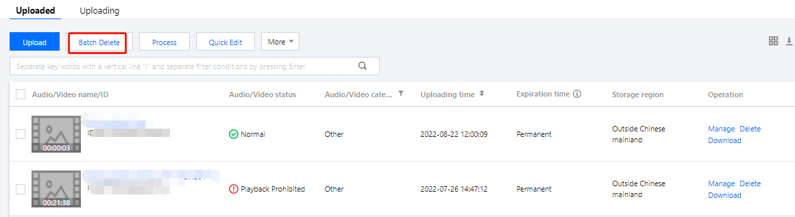 削除操作を実行すると、オーディオビデオはTencent Cloudから完全に削除され、回復できません。また、CDNノードからそのオーディオビデオにアクセスすることもできませんので、操作は慎重に行ってください。