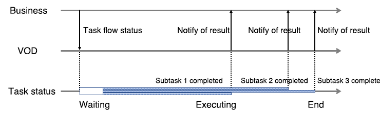 複数の独立タスクを同時に処理する場合は、複数のタスクIDが生成されるため、複数のタスクの結果通知を受信して処理する必要があります。複数のタスクの開始と通知を簡略化するために、VODではタスクフローを提供します。タスクフローは実質的に複数のサブタスクを含む「親タスク」であり、タスクフローを開始することは、タスクフローに含まれるすべてのサブタスクを開始することを意味します。
