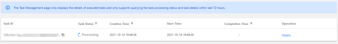 タスク状態 | 待機中:タスクがまだレディ・キュー状態であることを表します 完了済み:タスクがすでに完了していることを表し、タスク失敗もタスク完成もいずれも完了済みの状態に属します 処理中:タスクが処理中であることを表します |