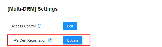 2. 左側ナビゲーションバーのDRM設定をクリックし、FPS証明書の登録に進み、更新ボタンをクリックして証明書をアップロードします。