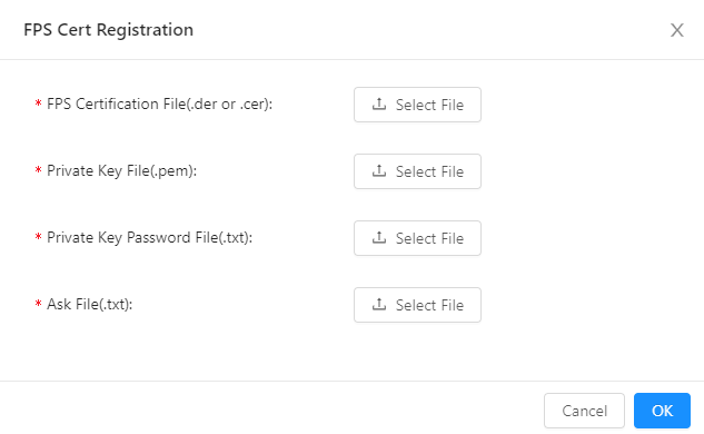 3. FPS証明書ファイル、秘密鍵ファイル、秘密鍵パスワードファイルおよびASKファイルをアップロードし、OKをクリックしてアップロードします。