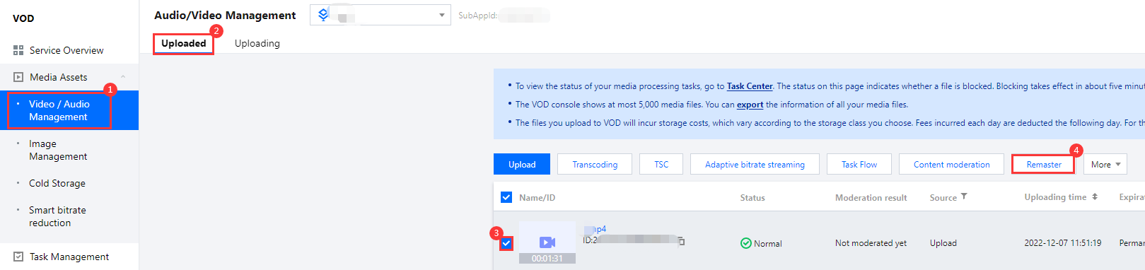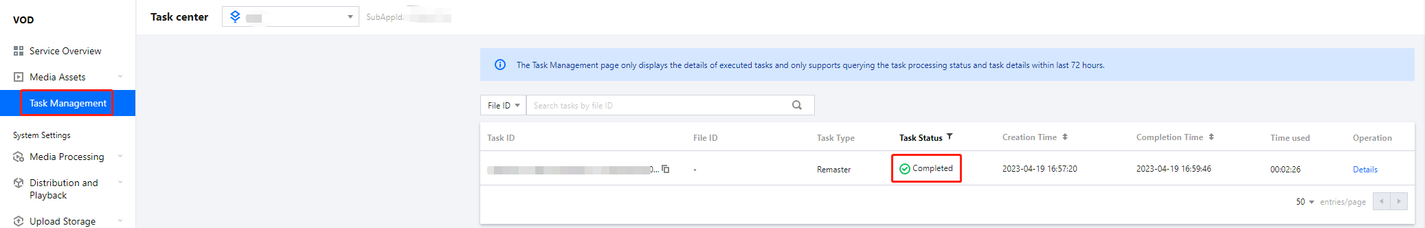 1. 左側ナビゲーションバーのタスクセンターをクリックし、タスク管理ページに進み、先ほど開始した音質/画質再生タスクを見つけます(タスクタイプは音質/画質再生です)。 2. タスクが完了したら、詳細をクリックし、音質/画質再生の結果を確認します。 ステップ3:オーディオビデオ管理で音質/画質再生の結果を確認する