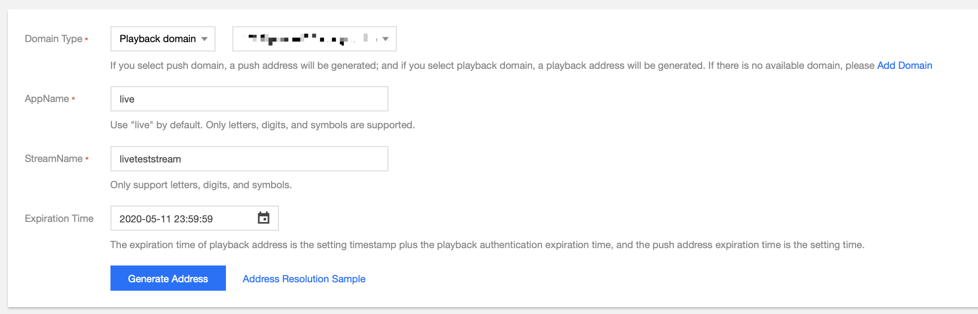 プッシュアドレスと同一のStreamNameを入力します。対応するストリームを再生するためには、再生アドレスのStreamNameはプッシュアドレスのStreamNameと一致させる必要があります。