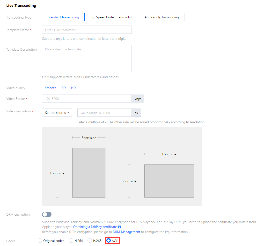 2. トランスコードテンプレートの作成をクリックして、トランスコードタイプは標準トランスコーディングまたは高速高画質トランスコーディングを選択し、高度な設定を開きます。