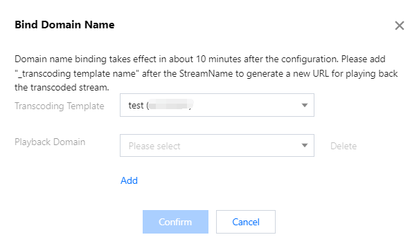 トランスコードテンプレートを選択し、ドメイン名のバインドをクリックして、バインドが必要なトランスコードテンプレートおよび再生ドメイン名を選択し、OKをクリックするとバインドが成功します。