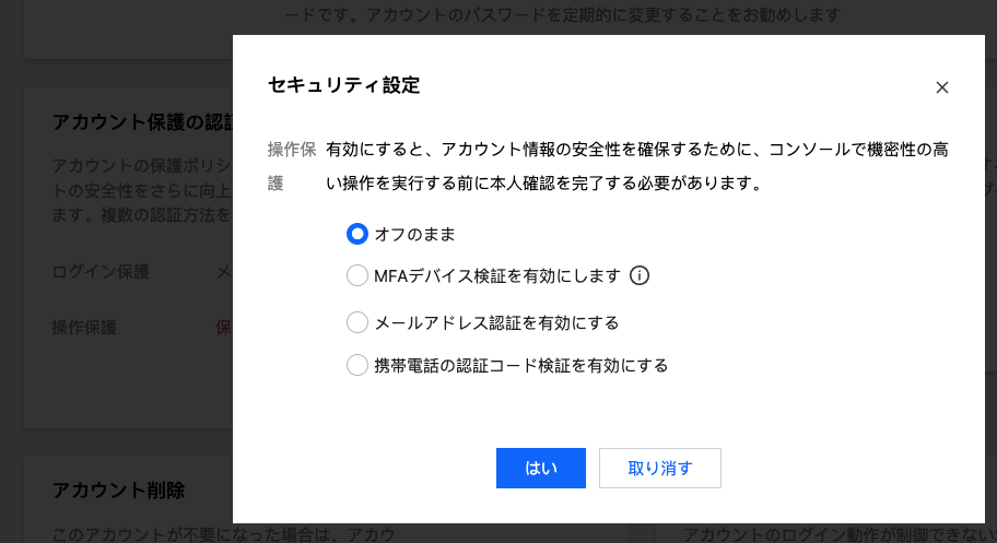携帯電話認証を有効化する | コンソールで関連操作を行う場合、認証ページに進むと、メールアドレスの認証コードを入力する必要があります。正しい認証コードを入力すれば、この操作を完了できます。そうでない場合、操作を実行できません。 |