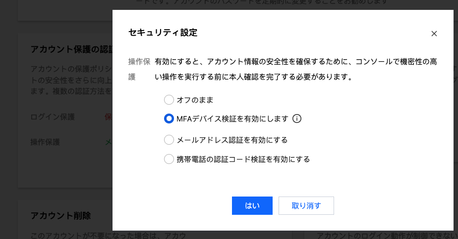 MFAデバイス認証を有効化する | 仮想MFAデバイス検証を有効化する:コンソールで関連操作を行う場合、本人確認ページに進み、MFA動的セキュリティコードを入力する必要があります。正しいMFA動的セキュリティコードを入力すれば、この操作を完了できます。そうでない場合、操作を実行できません。 U2Fセキュリティキー検証を有効化する:コンソールで関連操作を行う場合、本人確認ページに進むと、U2FハードウェアデバイスをコンピュータのUSBポートに挿入する必要があります。キー上のボタンをタッチして認証を完了させることで初めてこの操作を完了できます。そうでない場合、操作を実行できません。 |
