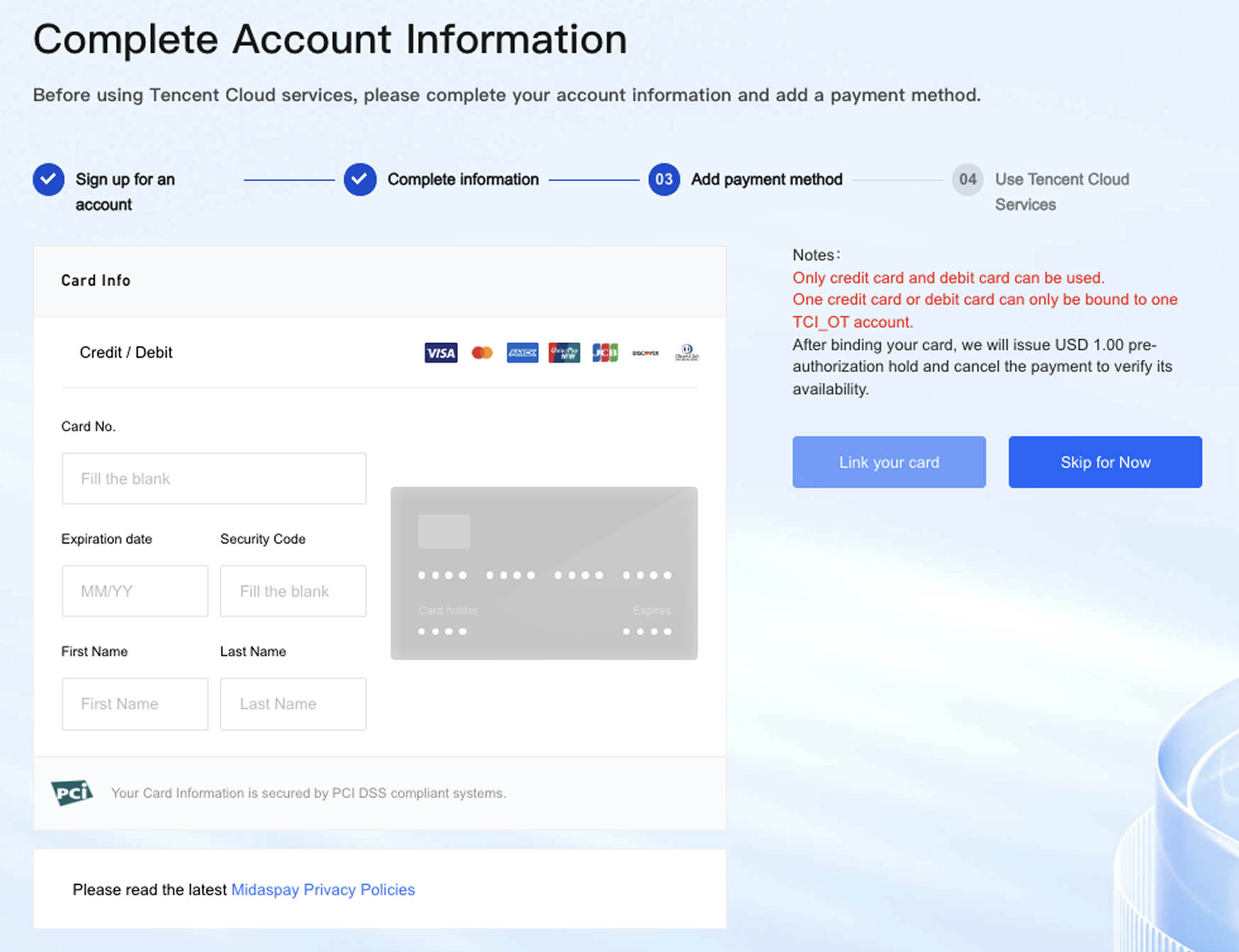 Tencent Cloudはプリペイドカード、バーチャルカード、ギフトカードをサポートしておらず、法人アカウントへの登録もサポートしていません。一部のカードブランドはデビットカードに対応していない場合があり、登録できない場合は他のカードで試してください。