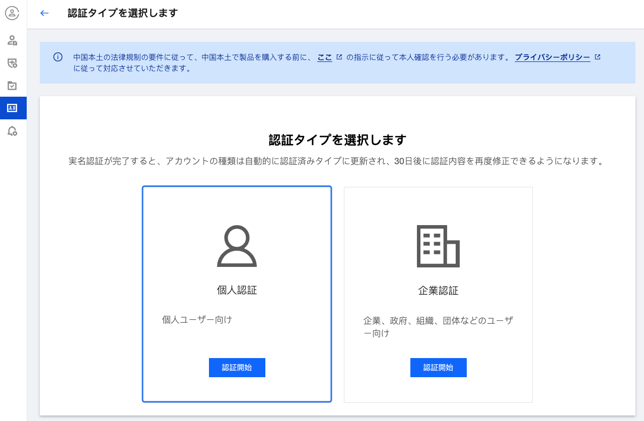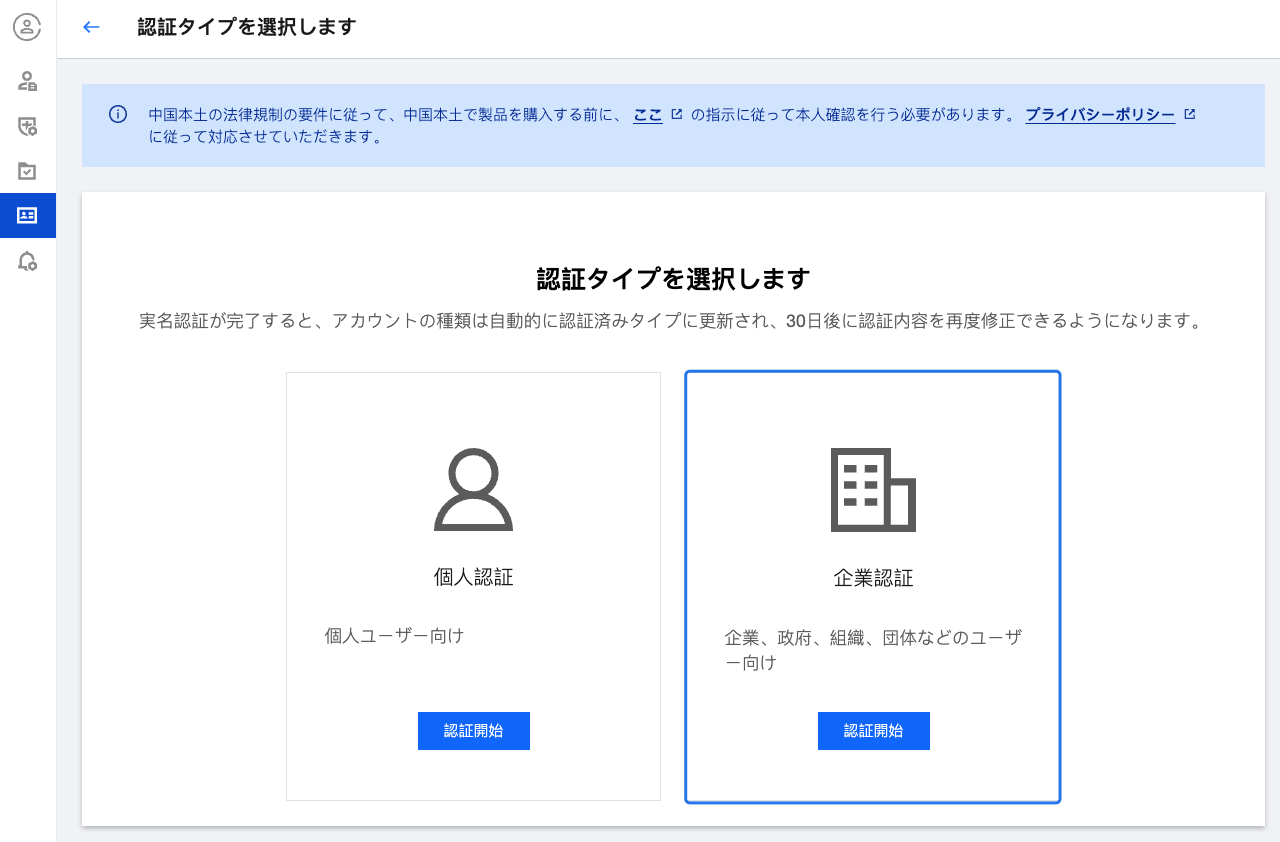 個人認証から企業認証への変更には時間制限がありません。その他の実名認証変更の場合は、前回の実名認証完了後30日後に変更が許可されます。