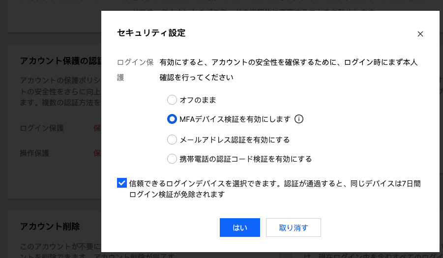 MFAデバイス検証を有効化する | MFAデバイス検証は仮想MFAデバイスとU2Fセキュリティキーに対応しています。具体的な設定については、MFAデバイスを参照してください。 仮想MFAデバイス検証を有効化する:アカウントとパスワードを入力して認証に成功した後、さらに正しいMFA動的セキュリティコードを入力することでログインが完了します。 U2Fセキュリティキー検証を有効化する:アカウントとパスワードを入力して認証に成功した後、U2FハードウェアデバイスをコンピュータのUSBポートに挿入し、キー上のボタンをタッチして認証を完了させることでログインが完了します。 |