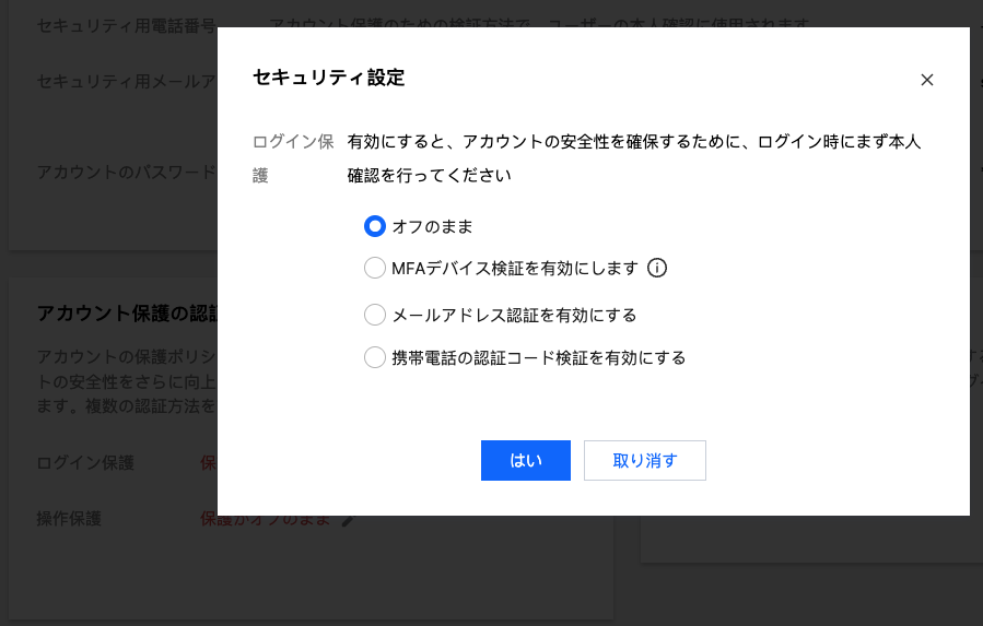 ログイン保護とは、ログイン操作を行う際に、Tencent Cloudが追加の保護を提供することです。通常、この保護の対策は、正しいアカウントとパスワードを入力した前提で、さらに身元を証明する認証情報を追加で入力する必要があります。
