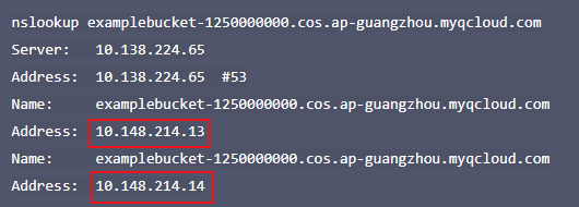 examplebucket-1250000000.cos.ap-guangzhou.myqcloud.comがターゲットバケットアドレスである場合、nslookupコマンドを実行すると次の情報を見ることができます。
