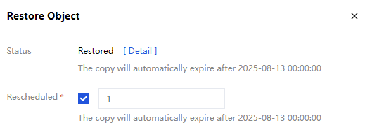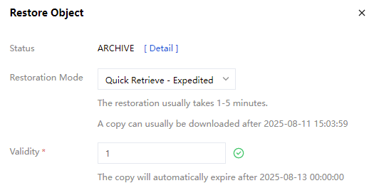 モードごとにデータ取得費用が異なります。詳細はデータ取得費用をご覧ください。 コピーの有効期間:コピーが自動的に期限切れになり、削除されるまでの日数を設定します。設定範囲は、最短1日、最長365日です。オブジェクトの復元が完了したら、もう一度復元をクリックして、ポップアップウィンドウでコピーの有効期間を変更することができます。
