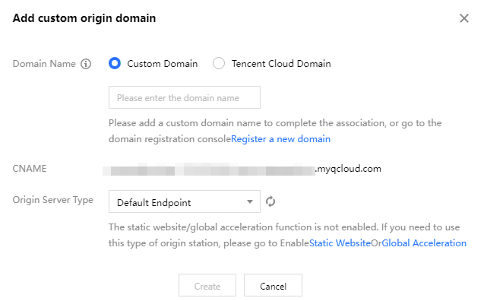 グローバルアクセラレーションのオリジンサーバー:カスタムドメインをグローバルアクセラレーションとして使用する場合は、まずバケットのグローバルアクセラレーション機能を有効にしてから、グローバルアクセラレーションのオリジンサーバーを選択してください。