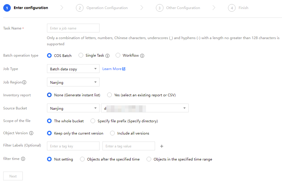 バッチ処理タイプ:COS Batchを選択すると、コピー、アーカイブなどの基本操作を行うことができます。独立タスクとワークフローを選択すると、Cloud Infiniteの関連サービスを利用できます。 タスクタイプ:COS Batchを選択した場合、データのコピー、アーカイブタイプオブジェクトの復元、削除のバッチ処理を選択できます。