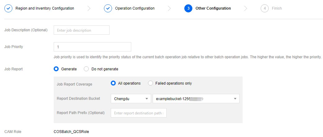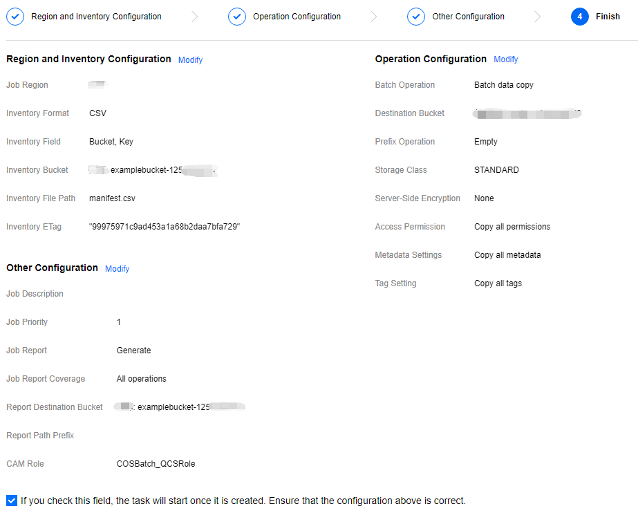 バッチ処理では、CAMロールを作成する方法でCOSバッチ処理の権限を付与する必要があります。CAMロールの詳細については、CAMロールの概要をご参照ください。 6. 次のステップをクリックし、入力したバッチ処理タスクの設定をチェックし、必要に応じてチェックを入れます。この項目にチェックを入れると、タスクは作成直後に起動します。上記の設定情報が正しいことを確認してください。