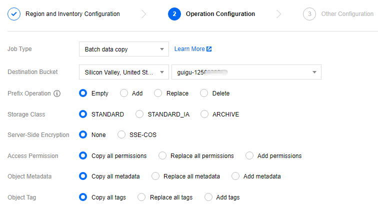サーバー側の暗号化:コピーされたオブジェクトに対し暗号化するかどうかを選択します。暗号化なしとSSE-COS暗号化から選択できます。