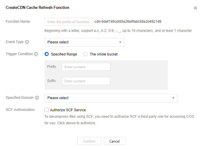 関数名:関数名は、関数の一意の識別名として、作成後に変更することはできません。SCFコンソールでこの関数を確認できます。 イベントタイプ:イベントとは、SCFをトリガーする操作です。アップロード操作を例に取ると、アップロード方法は、PUT Objectインターフェースを呼び出すか、Post Objectインターフェースを呼び出して行われます。選択したイベントがPUTタイプの場合、PUT Objectインターフェース経由でファイルをアップロードする操作のみがSCFをトリガーし、CDNエッジノードのキャッシュを更新します。 トリガー条件:イベントのトリガーとなるファイルソースの範囲を、すべてのバケットや指定したプレフィックス、指定した拡張子などで指定することができます。プレフィックスまたは拡張子を指定した後、ルールはマッチングするファイルソースに対してのみ有効になります。