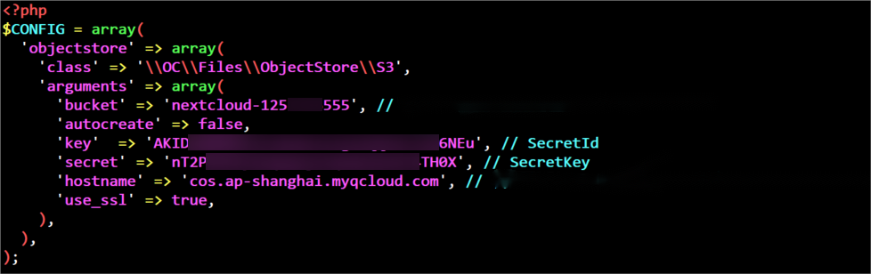 config.phpを作成し、次の内容を入力して、メモの内容に基づいて関連の値を変更します。<?php$CONFIG = array('objectstore' => array('class' => '\\\\OC\\\\Files\\\\ObjectStore\\\\S3','arguments' => array('bucket' => 'nextcloud-1250000000', // バケット名(スペース名)'autocreate' => false,'key' => 'AKIDxxxxxxxx', // ユーザーのSecretIdに置き換えます'secret' => 'xxxxxxxxxxxx', // ユーザーのSecretKeyに置き換えます'hostname' => 'cos.<Region>.myqcloud.com', // <Region>を所属リージョンに変更します(ap-shanghaiなど)'use_ssl' => true,),),);