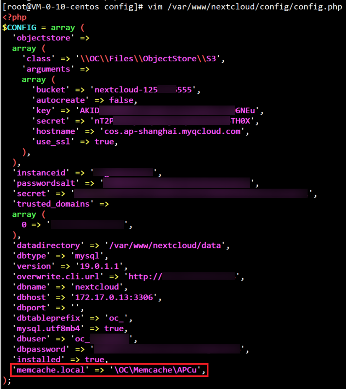vim /var/www/nextcloud/config/config.phpを実行し、NextCloudサーバーの設定ファイルを開き、$CONFIG = array ( の中に'memcache.local' => '\\OC\\Memcache\\APCu',という1行を追加します。その後ファイルを保存して終了します。