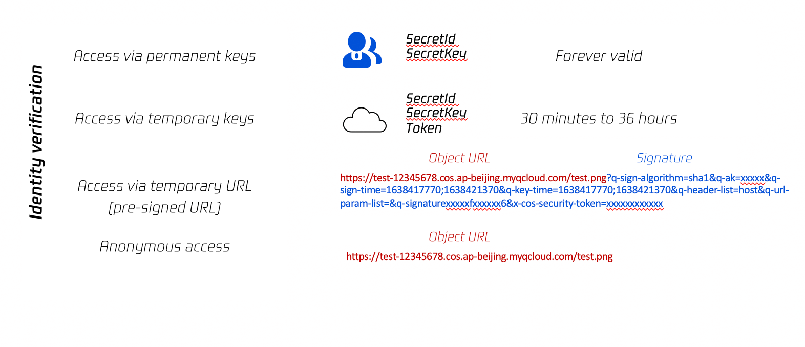 デフォルトではCOSバケットはプライベートであり、キー (パーマネントキー、一時キー)によるCOSアクセスであっても署名付きURLを使用したアクセスであっても、ID認証の段階を経る必要があります。