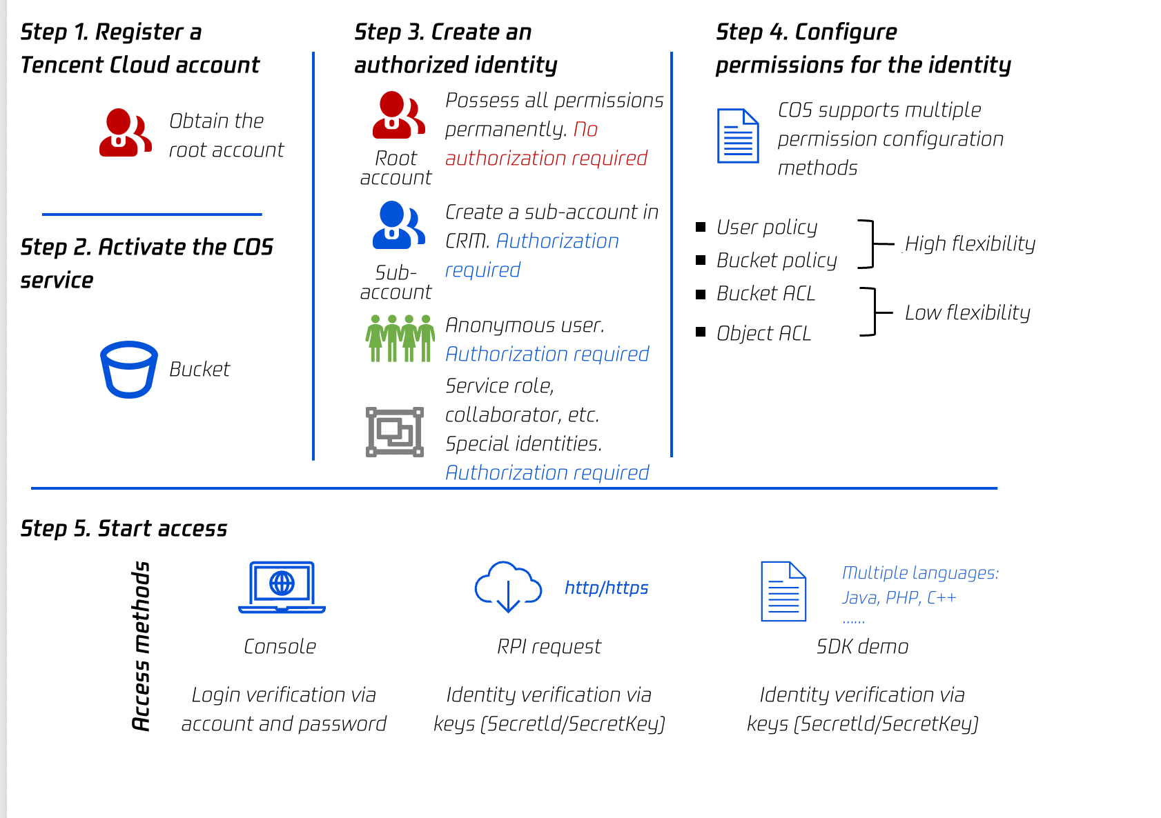 COSの権限承認およびID認証のフローは、Tencent Cloudアカウントの登録から始まる5段階となっています。Tencent Cloudアカウントの登録、COSサービスの有効化、権限承認IDの作成、IDへの権限設定、アクセスとID認証の開始、の5つです。
