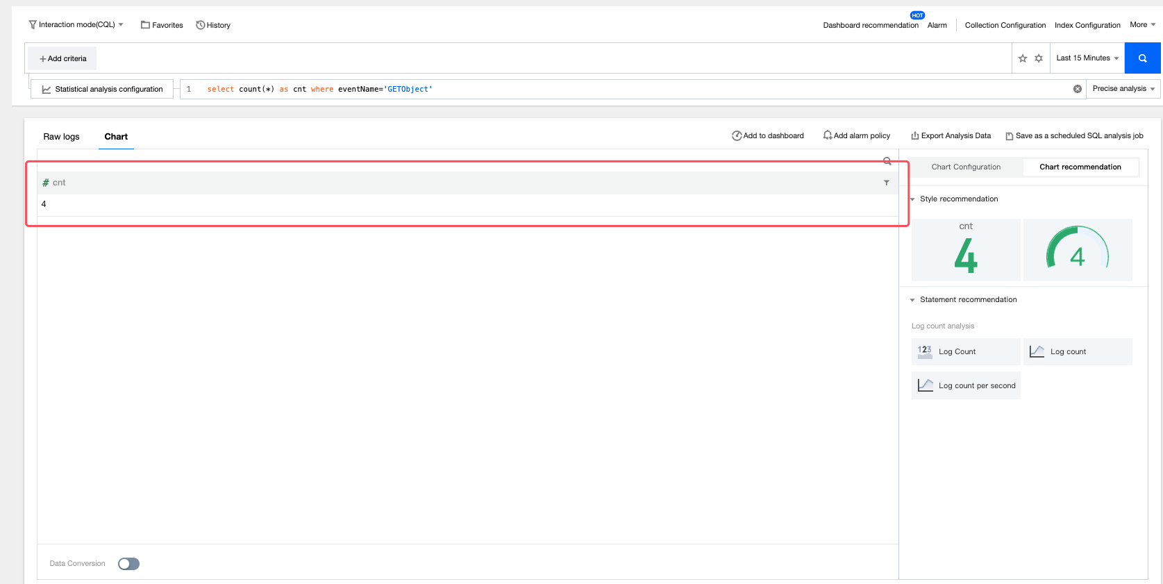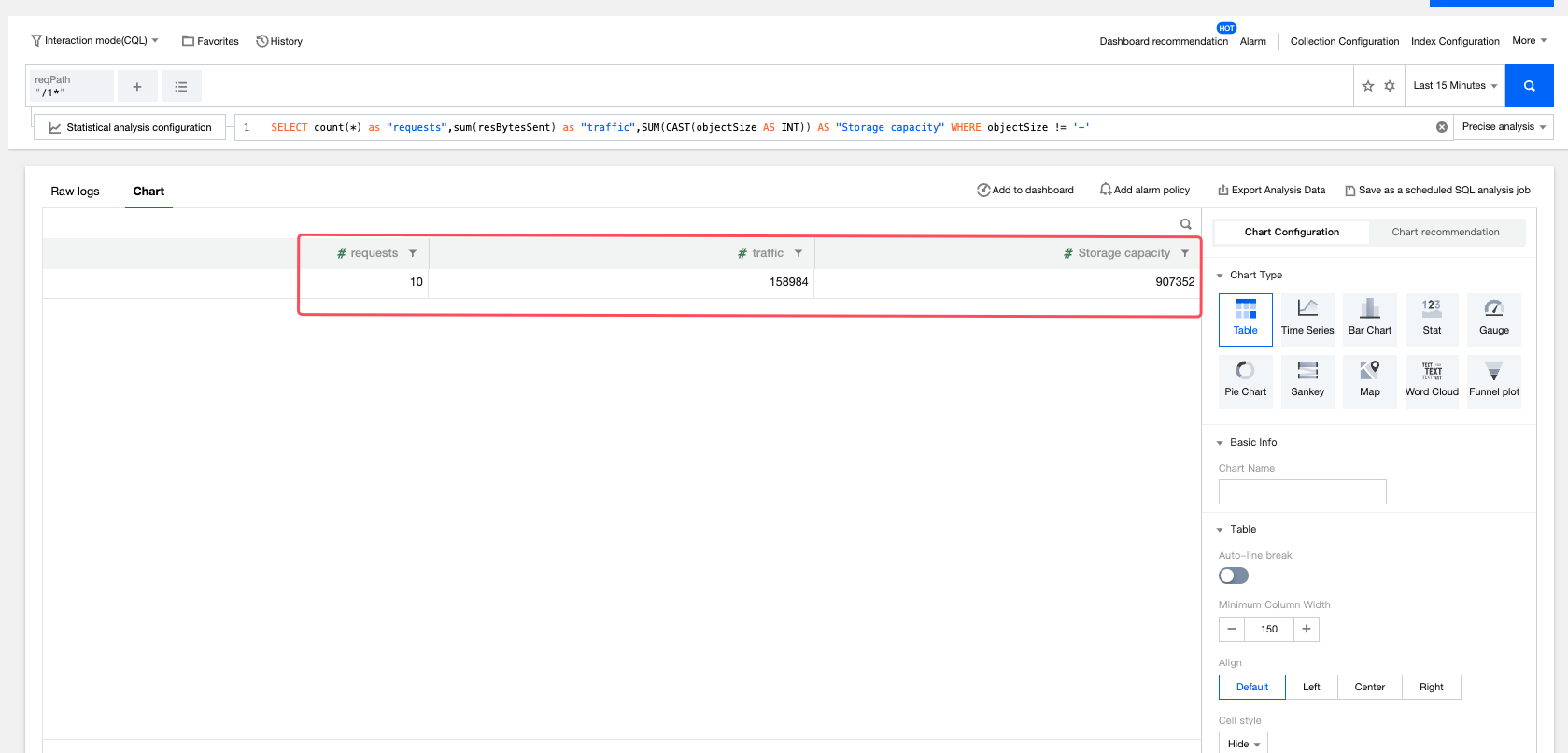 デフォルトでは、統計グラフは表形式で分析結果を表示しますが、右側の「グラフコンフィグレーション」を通じてグラフタイプや関連情報をカスタマイズすることができます。ストレージバケットアクセスログの可視化とアラートをさらに設定するには、CLS コンソールに移動してください。