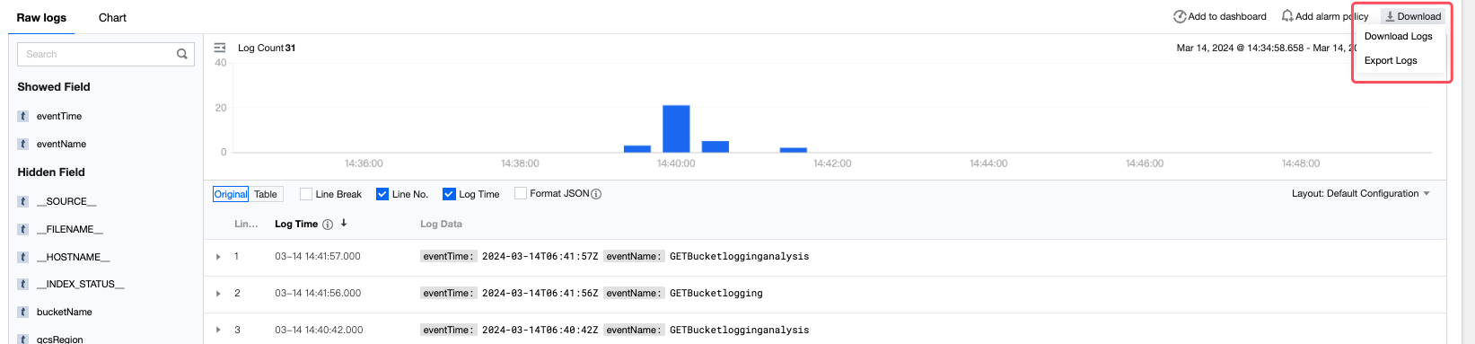 1. 右側のダウンロードボタンをクリックし、ログのダウンロードを選択します。