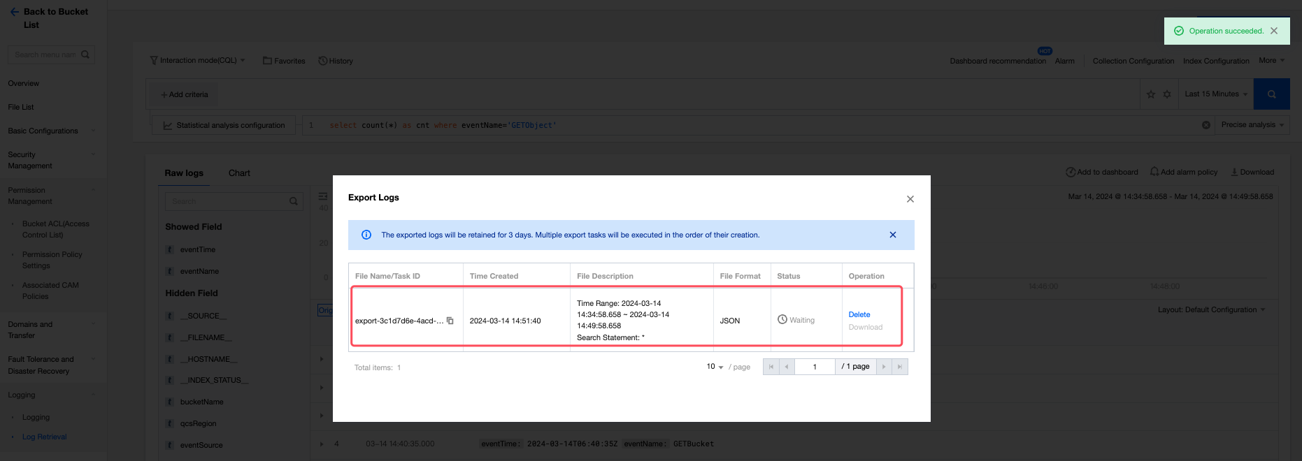 正常にオンにすると、このストレージバケットのアクセスログは CLS の同じ地域のログトピックに配信され、ログトピックが cos-log-store となります。初めてオンにするは承認が必要です。