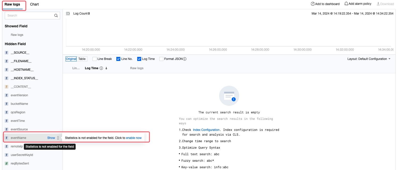 特定のフィールドによりログを統計分析したい場合は、必ずそのフィールドの統計情報をオンにしてください。次の2つの方法で速やかオンにすることができます。