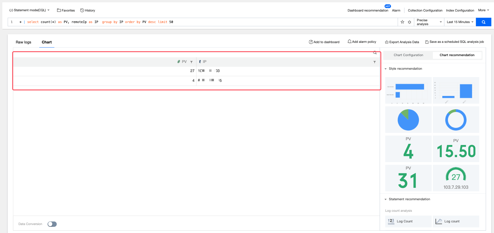 limit 50:検索結果の上位 50 件、つまり PV が最も高い 50 件の IP のみが返されます。